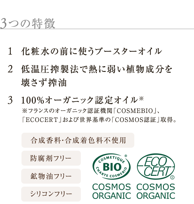 世界基準のCOSMOS認証およびフランスのオーガニック認証機関「COSMEBIO」「ECOCERT」の認証を取得しています。