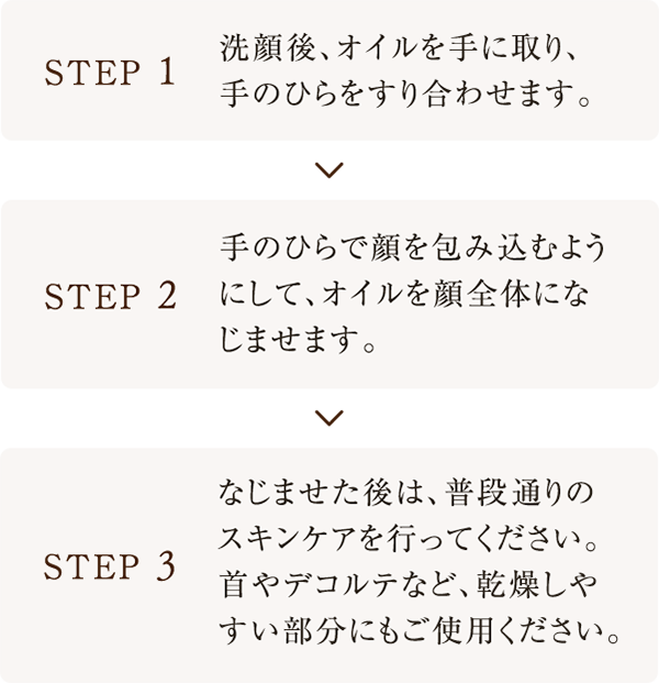 洗顔後、10円玉1枚分のオイルを手に取り、手のひら全体になじませてから、顔全体を包み込むようになじませます。その後は、普段通りのスキンケアを行ってください。