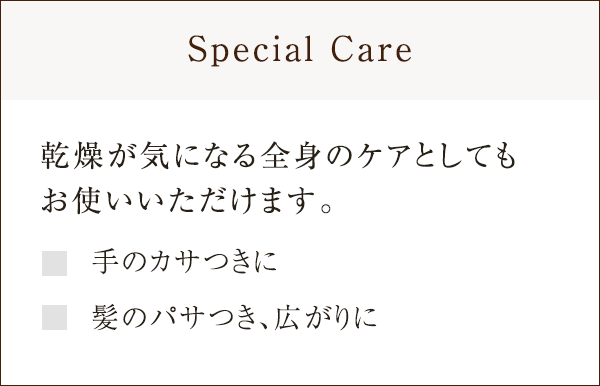 手指やかかとなど、乾燥が気になる全身のケアとしてもお使いいただけます。